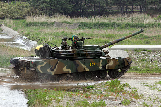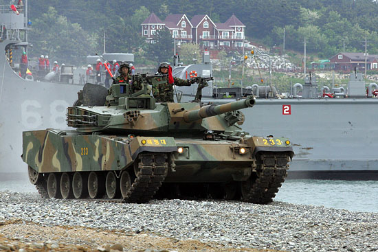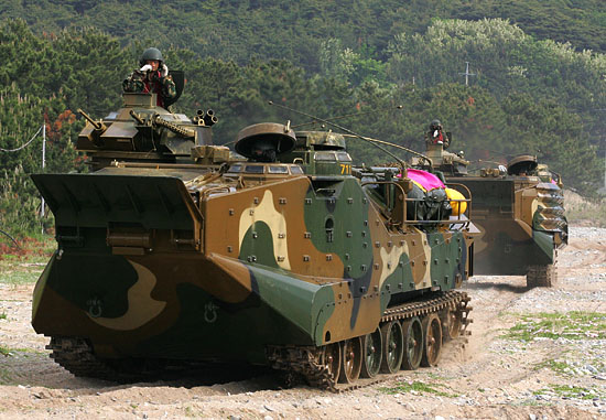 ▲해안에 상륙해 집결지로 이동하고 있는 힌국형 상륙 돌격 장갑차들(KAVV). [사진-통일뉴스 조성봉 기자]
