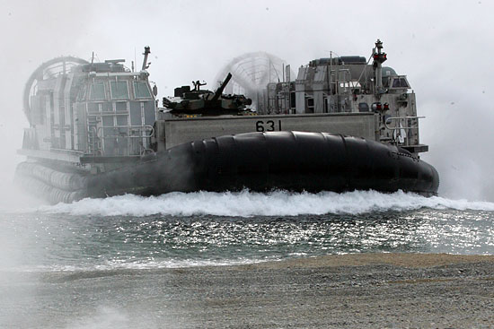 ▲해안으로 상륙하기 위해 물보라를 일으키며 빠른 속도로 이동하는 공기부양정. [사진-통일뉴스 조성봉 기자]