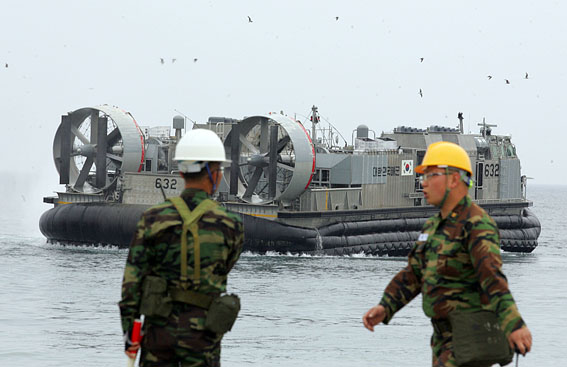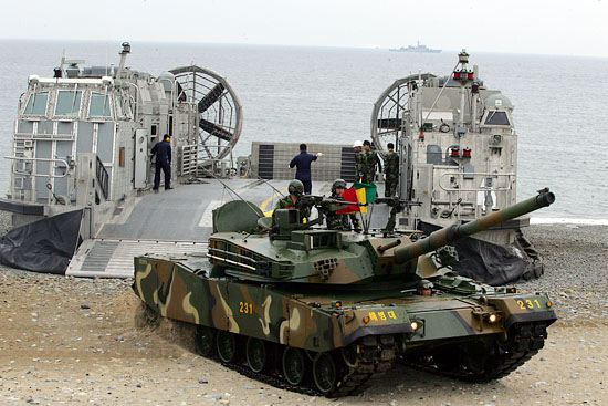 ▲공기부양정에 실린 한국형 장갑차가 해안에 도착해 집결지로 이동하고 있다. [사진-통일뉴스 조성봉 기자]