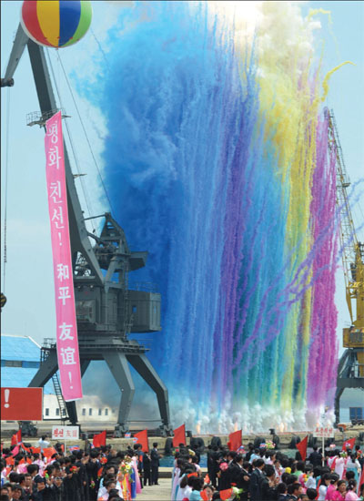 ▲ 착공식 개회선포와 함께 라진항과 선박에서 축포가 터지고 있다. [사진제공 - 민족21]