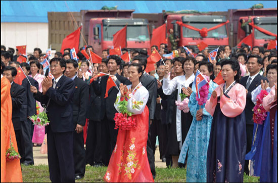 ▲ 착공식에 참석한 북 주민들이 중국기와 인공기를 들고 행사를 지켜보며 박수를 치고 있다. 뒤쪽으로 도로 건설에 투입될 트럭들이 세워져 있다. [사진제공 - 민족21]