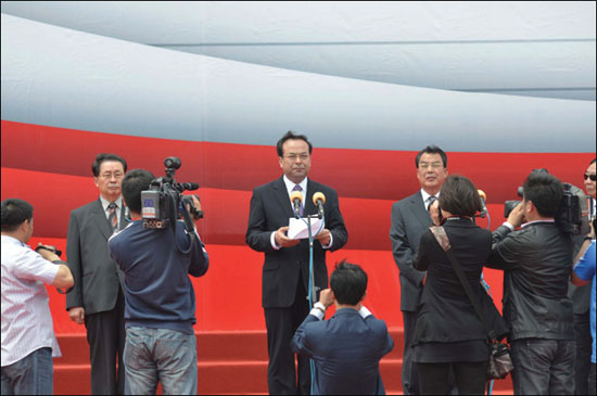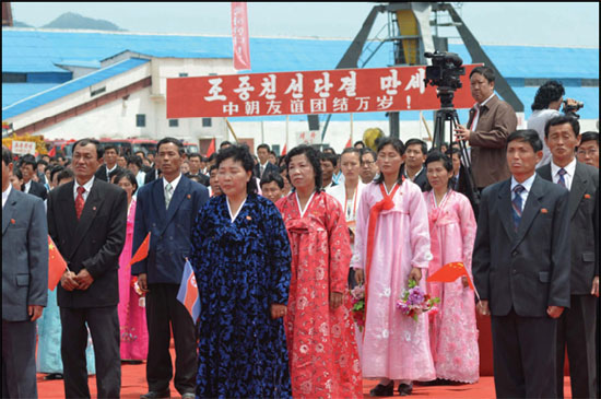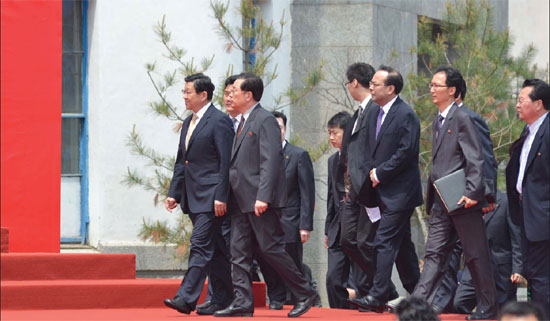 ▲ 착공식 행사장 중앙에 장성택 당 행정부장과 천더밍 상무부장(왼쪽)이 자리를 잡고 서 있다. [사진제공 - 민족21]