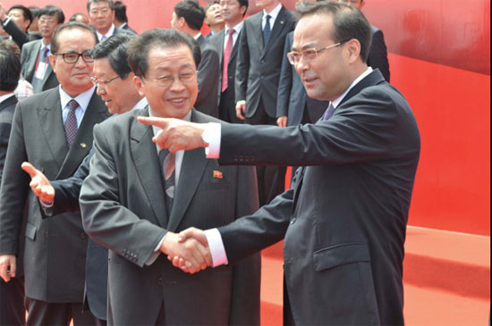 ▲ 장성택 노동당 행정부장(왼쪽)이 쑨정차이(孫政才) 지린성 당서기와 행사에 앞서 악수를 나누고 있다. 왼쪽으로 리수용 조선합영투자위원회 위원장의 모습이 보인다. [사진제공 - 민족21]