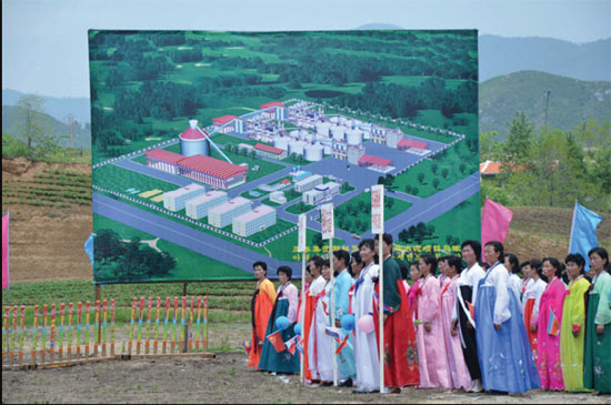 ▲ 공장 조성 부지에서 열린 ‘아태집단조선라선 연산100만 톤 시멘트공장 건설 착공식’에 한복을 곱게 차려 있고 참석한 북측의 여성참가자들이 중국기와 인공기를 들고 행사를 지켜보고 있다. 뒤쪽으로 시멘트공장의 조감도가 세워져 있다. [사진제공 - 민족21]