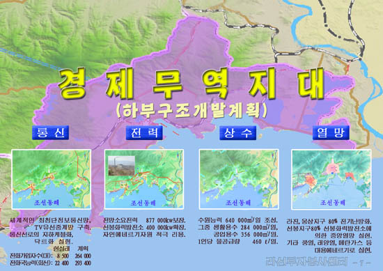 특히 “연간 300만 화물을 처리할 수 있는 라진항과 200-300만톤의 원유를 수송할 수 있는 선봉항, 연간 60만㎥ 목재를 처리할 수 있는 웅상항이 있으며, 이 항구들은 수심이 깊고 겨울철에도 얼지 않는다”면서 “라진항 앞에 대초도와 소초도가 가리워 방파제를 설치하지 않고도 앞으로 1억톤 이상의 화물 처리를 능력을 추구할 수 있는 유리한 조건을 가지고 있다”고 소개했다.