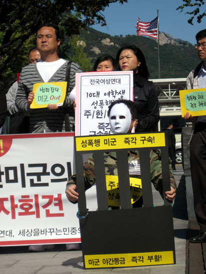 박희진 한국청년연대 공동대표는 “영화 ‘도가니’ 이후 성폭행이 굉장히 큰 이슈가 되고 있다”며 “주한미군의 10대 여학생에 대한 성폭행 사건을 보면서 왜 이것은 그토록 언론에서 조용한가 의문을 가질 수 밖에 없다”고 꼬집었다.