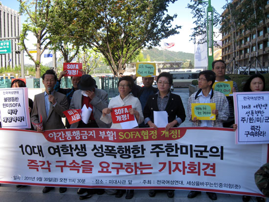 지난 24일 동두천에서 술에 취한 주한미군이 10대 여학생을 성폭행하고도 신병이 미군 헌병대에 인계된 사실이 알려지자 시민사회단체들이 강하게 반발하며 SOFA(주둔군지위협정) 개정을 촉구해 나섰다.