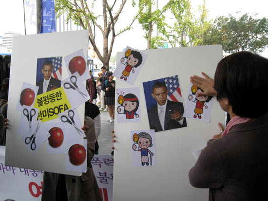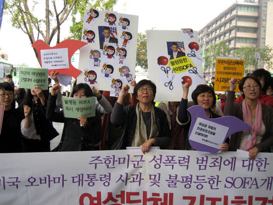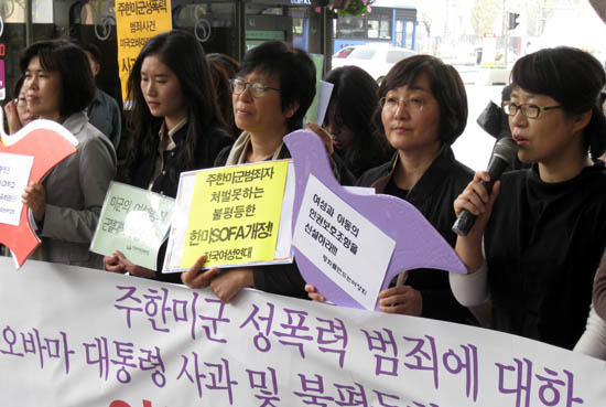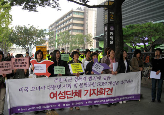 이명박 대통령의 미국 방문을 앞두고 10일 오전 10시 여성단체들이 미국대사관 인근 KT 앞에서 주한미군의 여학생 성폭행 사건에 대해 오바마 대통령의 사과와 한.미 소파(SOFA, 주둔군지위협정) 개정을 요구하는 기자회견을 진행했다.