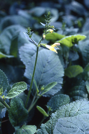 참배암차즈기는 산에서 자라는 여러해살이풀(多年草)로 그 모양이 특이한 이 땅 특산종이다. 줄기에는 털이 나 있고 이파리는 둥글게 마주나는데, 위로 올라갈수록 잎자루가 짧아져 바투 달린다. 8~9월에 걸쳐 줄기 위쪽 마디마다 입술 모양의 노란색 꽃을 피우는데, 암술대가 윗입술 아래로 길게 뻗어 나와 마치 뱀 혓바닥처럼 보인다고 해서 이런 이름을 가진 듯하다. 약초로 이름난 단삼은 꽃 색깔만 다를 뿐 참배암차즈기를 빼닮은 형제종인데, 정작 이름바탕이 된 차즈기는 촌수가 좀 뜨다.