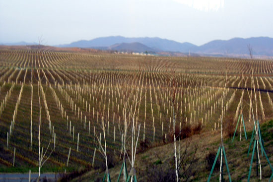 ■ 대동강 과수농원은 천 정보(3백만 평)가 넘는 아주 넓은 땅에 사과나무 같은 것을 심어놨더라. 천 정보니까 엄청 넓은데다가 하나 좀 특이한 게 우리는 사과나무가 좀 굵지 않나, 거기는 가늘다. 엄지손가락 굵기 정도 밖에 안 되는데 거기에 사과가 열린다는 것이다. 그리고 상당히 밀식을 해놨더라. 새로운 밀식법인지 모르겠다. 이태리에서 묘목을 많이 줘서 심었다고 들었다.