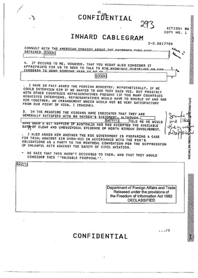 1988년 1월 29일자 문서는 호주 외무부의 사건에 대한 잠정 판단(PRELIMINARY ASSESSMENT)을 담고 있다. 이 문서에 따르면, 사건이 북에 의해 일어났다는 것에 대한 강한 증거들이 있다고 한다(290쪽). 그리고 1월 22일에 발표된 장관 성명서에는 북을 직접 지목하지 않았다면서 증거들을 더 검토한 뒤 장관에게 보고할 예정이라고 적고 있다. 1988년 1월 29일자 문서는 서울에서 호주 대사가 직접 작성했는데, 이에 따르면 한국의 외교관리로 추정되는 이가 외무부장관 성명서에 대해 언급했다. 그는 대사에게 만약 호주가 북의 개입에 대한 (한국 정부의) 분명하고 확실한 증거를(CLEAR AND UNEQUIVOCAL EVIDENCE) 인정했다면 좀더 좋았을 것이라고 말했다(293쪽). 어떤 면에서 호주의 성명서가 그만큼 신중했다는 이야기인데, 호주 외무부 관리는 이와 관련해 한국이 "실망을 했다는 뜻으로 들린다(Sounds to me like they were disappointed)"고 메모를 남겼다.