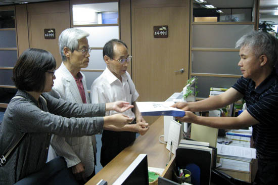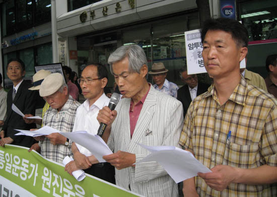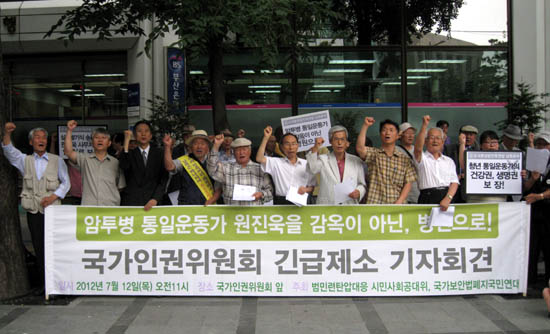 '범민련탄압대응 시민사회공대위'(공대위)는 12일 오전 11시 서울 을지로1가 국가인권위원회 앞에서 ‘암투병 원진욱 사무처장 국가인권위원회 긴급구제 제소 기자회견’을 갖고 진정서를 국가인권위원회에 제출했다.