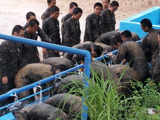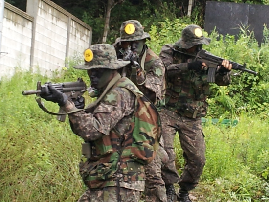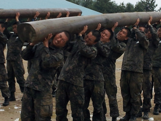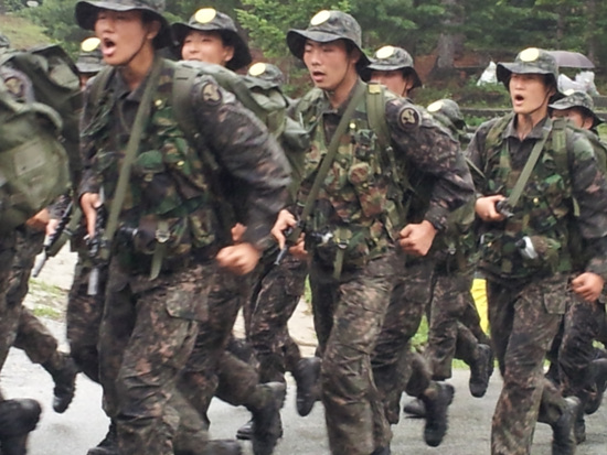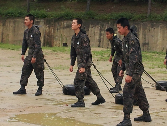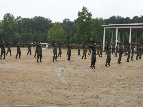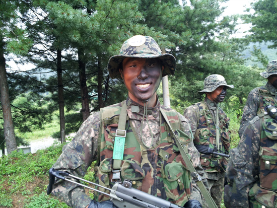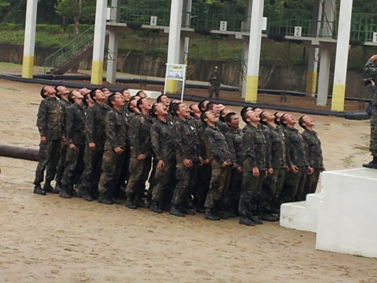 지난 11일 오전 경기도 광주시 특수전교육단에서 육군 특공·수색 첫 지원병 훈련이 진행됐다. 227명의 훈련병들은 지난 3월 육군훈련소에서 5주간의 기초군사훈련을 마치고 이곳 특수전교육단에 3주간 특수작전 수행능력을 위한 극한의 훈련을 받고 정예 특급전사로 다시 태어나고 있다. / 편집자 주 ▲ 연병장에서 피티체조를 하고 있는 훈련병들.▲ “아이쿠 힘들어라!” 목봉체조를 하고 있는 훈련병들. ▲ 젖 먹던 힘까지 다 내 “야------”▲ 훈련 뒤엔 씻는 게 꿀맛.▲ 타이어 달고 달릴 준비를 하는 훈련병들. ▲ “우리는 특공수색병이다!” 산악구보를 하고 있는 훈련병들. ▲ “저 위장 잘 됐어요?” 위장크림을 얼굴에 바른 한 훈련병이 밝게 웃고 있다.▲ 특수작전 수행능력 목표정찰 훈련을 하고 있는 훈련병들.