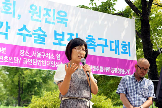 이들은 ‘범민련 인사 노수희, 원진욱 서신.접견 금지 해제, 외래진료 보장 촉구대회’를 열어 “원진욱 처장은 서울구치소 지정병원인 한림대학교 성심병원에서 ‘조직검사를 할 필요 없고, 빨리 외과적 수술을 해야 한다’는 진단을 받았다”며 “공안검사의 자의적 판단만으로 젊디젊은 통일운동가의 생명이 좌우될 수 있는 매우 비상식적이고도 무자비한 인권탄압의 사각지대로 내던져져 있다”고 우려를 표했다.