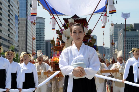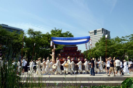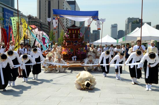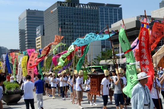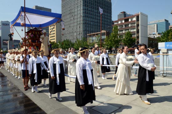 이날 오전 10시께 서울 광화문광장 앞에서 400여명이 참여한 가운데 ‘고양 선공감 김감역 상여.회다지소리 보존회’가 주관한 진혼제는 이순신 장군상에서 출발해 서울 중학동 주한일본대사관 앞에 도착해 소녀상 앞에서 진혼제를 거행했다.