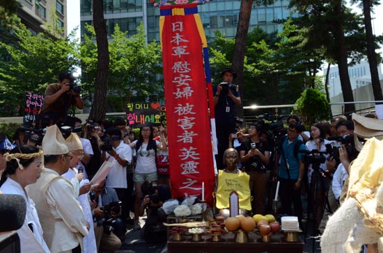 주최측은 “국민의 어머니인 피해자 할머니들의 억울하고 통탄하지 않을 수 없는 역사를 만국 만방에 고하기 위하여, 금년 8.15 광복절을 앞두고 국가적인 ‘위안부’ 진혼제를 일본 대사관 앞에서 거행한다”고 밝혔다.