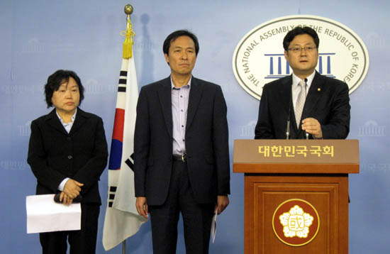 민주통합당 우상호, 인재근, 홍익표 의원은 13일 오후 2시 10분 국회 정론관에서 기자회견을 갖고 전날 북한이 우리 정부의 대북 수해지원을 거부한데 대해 성명을 발표했다.
