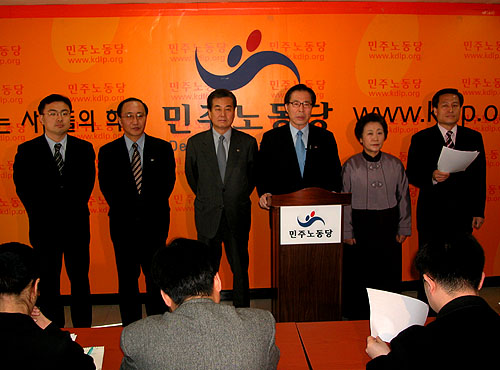 | ▶19일 민주노동당이 기자회견을 갖고 향후 행동계획을 발표했다. 왼쪽부터 신장식 기획위원장, 노회찬 사무총장, 천영세 부대표, 권영길 대표, 김혜경 부대표, 이상현 대변인. [사진 - 통일뉴스 김치관기자] |