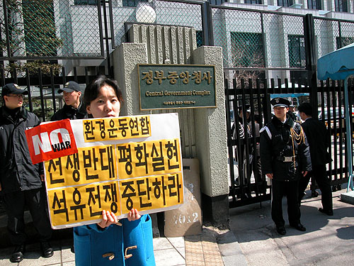 | ▶19일 전쟁을 반대하고 우리 정부의 전쟁지지를 반대하는 1인 시위가 줄을 이었다. 사진은 환경운동연합 박경애씨가 세종로 정부종합청사 앞에서 1인시위를 하고 있는 모습. [사진 - 통일뉴스 김치관기자] |