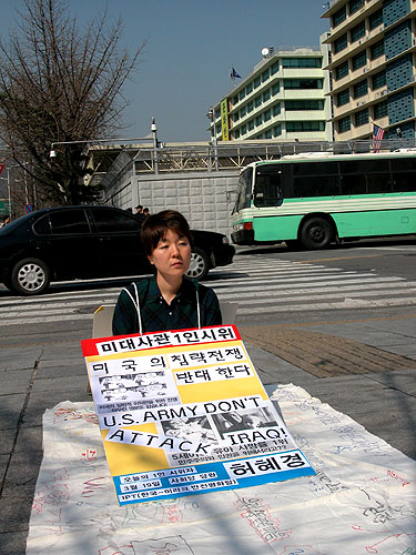 미국의 이라크 최후통첩 이튿날인 19일 전쟁을 반대하고 한국정부의 전쟁지지와 파병을 반대하는 1인 시위가 줄을 이었다.