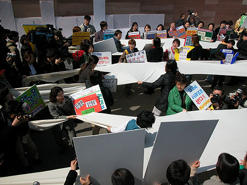 미국, 영국, 스페인이 이라크 여성들을 폭력으로 억압하는 장면을 연출한 뒤, “한국 여성들의 연대의 기운을 모으자”는 사회자의 호소에 참가자들은 흰 천을 맞잡았고 ‘천을 가르며 평화의 길을 만든다’는 취지로 천을 갈랐다. 참가자들은 찢긴 천을 이어 원을 만들어 잡고 반전평화 구호를 외치며 퍼포먼스를 마쳤다.