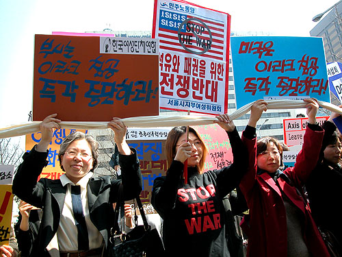 이에 앞서 참가자들은 이오경숙 여연 상임대표와 이김현숙 평화를 만드는 여성회 공동대표가 낭독한 `미국의 이라크 침공과 한국군 파병을 반대하는 여성들의 입장` 을 통해 “전쟁은 그 어떠한 이유로도 정당화 될수 없다”며 “전쟁의 최대 피해자는 군인들보다 주로 싸울 의지도 힘도 없는 민간인들이다. 난민의 80%가 주로 여성과 아이들”이라고 지적했다.