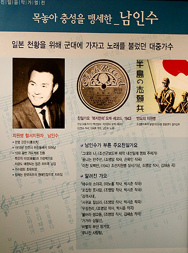 ■ 36년의 일제 식민통치는 친일파의 조직적 협력이 있었기 때문에 가능한 것이다. 음악은 선전선동의 최일선에 서 있었다. 특히 이번 전시 준비를 하면서 남인수나 백년설이 혈서까지 쓰기도 했다는 것이 밝혀졌다.