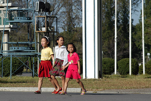 | ▶오손도손 이야기 꽃을 피우며 인민문화궁전 앞을 지나고 있는 아이들. [사진 - 통일뉴스 송정미기자] |