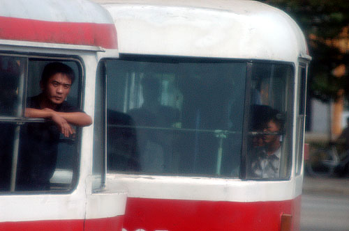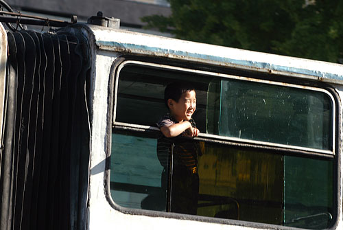 | ▶한 아이가 전동 버스밖으로 얼굴을 내밀고 환하게 웃고 있다. [사진 - 통일뉴스 송정미기자] |