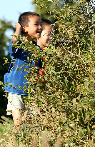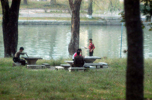 | ▶인민대학습당 앞 공원에서 아이들이 잠자리채를 가지고 친구들과 놀고 있는 모습. [사진 - 통일뉴스 송정미기자] |