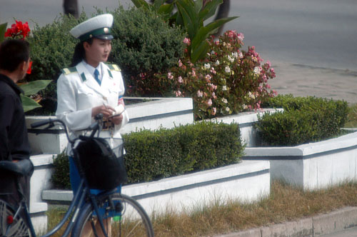 | ▶여자 교통 안내원이 교통 신호를 위반한 듯한 시민에게 세워 놓고 뭔가를 적고 있다. [사진 - 통일뉴스 송정미기자] |