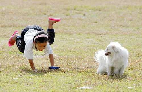 | ▶평양 시내 한 음식점 옆 조그만 잔디밭에서 한 어린아이가 강아지와 놀고 있는 모습. [사진 - 통일뉴스 송정미기자] |