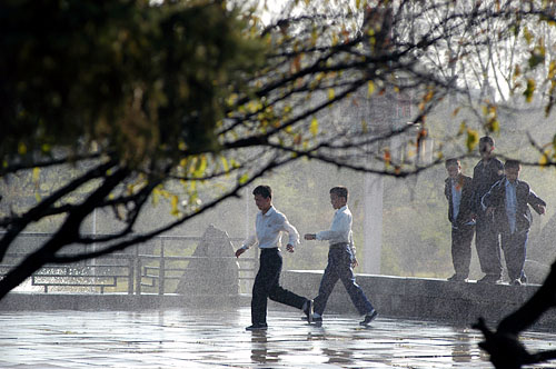 | ▶인민대학습당 앞 분수대를 지나는 한 시민이 분수대에서 뿌려지는 물방울을 피해 걷고 있는 모습. [사진 - 통일뉴스 송정미기자] |