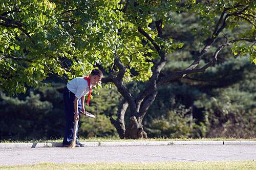 | ▶만수대대기념비가 있는 곳 주변을 청소하고 있는 한 소년. [사진 - 통일뉴스 송정미기자] |