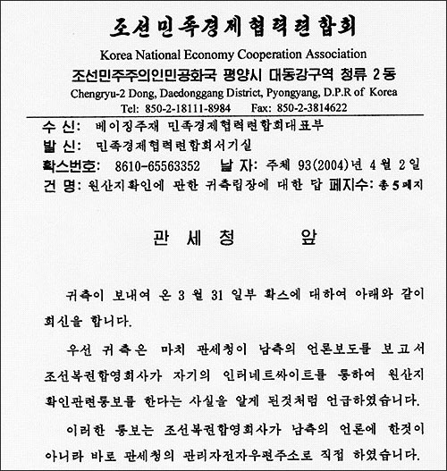 우선 귀측은 마치 관세청이 남측의 언론보도를 보고서 조선복권합영회사가 자기의 인터네트 싸이트를 통하여 원산지확인관련통보를 한다는 사실을 알게 된 것처럼 언급하였습니다. 계약당사자인 민경련이 대방인 귀측에 직접 통지문을 보냈는데 통신수단을 어떤것을 리용 하는가를 문제시한다면 서로의 신뢰를 어떻게 담보하겠습니까. 또한 우리는 조선민족경제협력련합회의 공식도장이 찍힌 공문을 조선복권합영회사 공지에도 올려 두었습니다. 귀측의 언론들은 이를 확인하고 사실보도를 하였으며, 귀측에서도 응당 조선복권합영회사 싸이트를 확인했을것인데도 사실 유무를 굳이 확스를 통하여 확인하여 달라고 하는지 리해가 되지 않습니다. 우리가 이번에 인터네트를 통하여 원산지증명서의 정확성 여부를 확인해주는 사업을 제안한 것은 우선 남측 기업들이 공화국에서 수입한 물품을 세관수속할때에 시간을 크게 줄여 주고 불필요한 사람들이 끼여들어 원산지증명서를 위조하는 현상을 없애고 북과 남사이의 협력사업을 더 잘 해나가자는 의도에서입니다. 현 시점에서 원산지확인사업에 인터네트보다 더 효률적이고 정확한 수단은 없다고 봅니다. 결국 우리가 인터네트로 원산지증명서발급통보사업을 하게 되면 북과 남이 다 같이 실익이 생기게 되는 것입니다. 확스를 통한 원산지증명서확인보다 인트네트를 통한 확인사업은 누가 보아도 시간을 줄이고 신속하고 투명한 방도입니다. 확스로 서류를 주고 받으면 서류의 내용도 제대로 보기 힘듭니다. 이러한 문제를 개선하는 것이 인트네트를 리용한 방법임을 모르는 사람은 없을 것입니다. 우리의 노력에 대하여 옳바른 평가를 먼저 하고 그리고 귀측의 제안을 주는 것이 옳은 일입니다. 다음으로 귀측이 지적한 영업비밀문제에 대하여 언급합니다. 귀측에서 공화국으로부터 물품을 수입하는 기업은 귀측당국의 승인을 받고 남측 법에 따라 상품의 원산지, 수출자, 수입자, 상품명 등을 모든 사람이 알수 있도록 표식하고 있습니다. 이것은 국제무역거래의 일반적관례이기도 합니다. 그리고 지금까지의 사례를 보면 귀측의 언론들은 계약도 되지 않은 상태에서 우리에게 어떠한 문의도 없이 우리의 기업 어디와 남측 기업 어디가 무슨 물품을 거래할 예정이라고까지 종종 공개하고 있습니다. 그렇다면 상품표기를 이렇게 일반적인 교역내용 (수출자, 수입자, 상품명)에 대하여 밝힌것을 인터네트에 공개하는것이 무슨 영업비밀 이고 무엇을 보호해야한다는것입니까. 북남간의 원산지증명서발급통보사업을 신속하고 투명하게 이루어지도록 하는 가장 좋은 방법이 인터네트를 통한 방법임은 귀측에서도 잘 알고 있으리라 봅니다. 우리가 공개하면 잘못된 것이고 남측의 언론이나 남측 싸이트에서 공개하는것은 옳은 일이라는 주장을 하는 것은 정확한 리해가 아니라고 봅니다. 량측이 신뢰를 구축하기 위해서는 모든 내용을 투명하게 하여야 할 것입니다. 우리는 이를 위하여 더욱 노력할 것입니다. 귀측에서도 신속하고 투명한 북남 간의 교역이 이루어질 수 있도록 적극적으로 협조하는 것이 북남 간의 교류협력을 증진하는 길이고 또한 귀측의 기업을 돕는 길임을 아시고 적극적으로 협조하여 줄 것을 부탁드립니다. 끝으로 우리는 이 서한을 공개적으로 조선복권합영회사의 공지에 등록하고 또 같은 내용을 귀측의 관리자메일로 통보하는 한편 귀측이 원하는 확스로도 보내드립니다. 경의