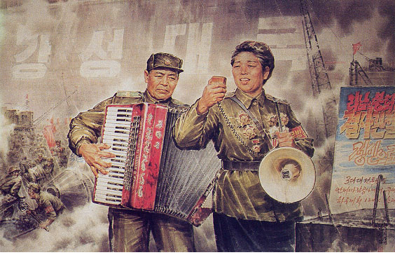 이들은 현역 군인이나 고급 장교가 아니다. 현역 군인이나 장교라면 현장에서 진두지휘를 해야지 아코디언을 연주하고 노래를 부를 리는 없다. 이들은 퇴역한 군인이다. 이 정도의 나이면 손주의 재롱에 재미를 붙일 나이다. 환갑이 넘었다는 말이다. 젊은이들이 위기에 처한 나라를 구하고 강성대국을 건설하기 위해 모두 떨쳐나섰다. 늙은이라고 뒤로 물러서서 ‘에헴’할 수는 없다. 노동력을 상실한 늙은이들이 군복을 입고 나섰다.
