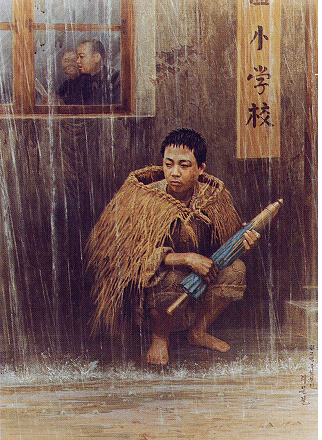 작품 속으로 들어가 보자. 짚으로 만든 우비를 쓰고 학교 입구에서 누군가를 기다리고 있는 소년은 머슴이나 종이다. 허름한 옷에 신발도 없다. 우측 상단에는 무슨 소학교라는 간판글자가 보이는데, 지금 같으면 중, 고등학교 정도 될 것이다. 소년 머슴은 비 오는 날, 주인집 아들에게 우산을 씌워 주려고 기다리고 있다.