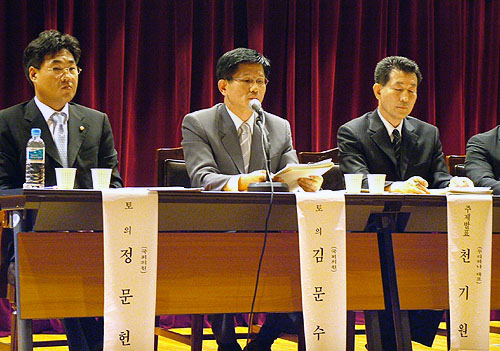 23일 오후 2시 여의도 국회도서관 지하 1층 대강당에서 열린 한나라당 ‘납북자및탈북자인권특위’가 주최한 ‘북한이탈주민문제의 현실적인 방안 마련을 위한 공청회’에서 토론에 참여한 김문수 의원은 탈북자문제에 적극적이지 않는 현정부에 대해 탈북자의 인권을 거론하며 비판을 제기했다.