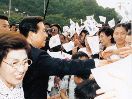 김대중 대통령 내외가 서울공항 입구까지 환송 나온 시민들과 악수를 나누고 있다.
