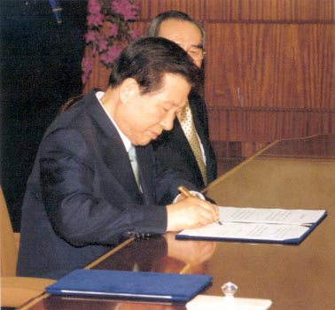 백화원 영빈관에서 남북정상회담을 마친 후 공동선언문에 서명하는 김대중 대통령