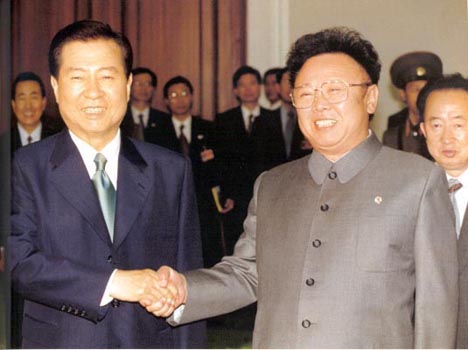 2차 단독정상회담을 앞두고 악수를 나누는 두정상 2000-08-24 연합뉴스 김대중 대통령과 김정일 국방위원장이 14일 오후 평양 백화원 영빈관에서 2차 단독정상회담에 앞서 악수하고 있다.