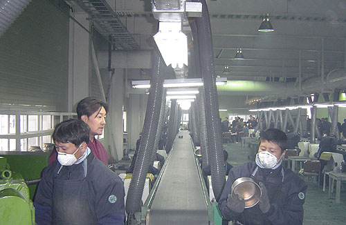 지난해 12월 15일 첫 준공식을 개최한 스텐레스 주방용품 생산업체 리빙아트의 공장 내부 전경 사진 중 북측 근로자들이 매캐한 연기 속에서 일하는 사진이 보도 돼 눈살을 찌푸리게 했지만 지금은 숙련도가 높아져 연기가 거의 발생하지 않는다고 조명균 단장은 덧붙였다.