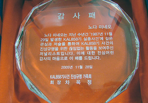 본지 이계환 대표와 시민의 신문 백찬흥 이사가 참석해 감사패를 전달 받았으나, 입국 금지 상태인 노다 미네오 씨는 가족회 차옥정 회장으로부터 대책위 집행위원장인 신성국 신부가 대신 받았다.