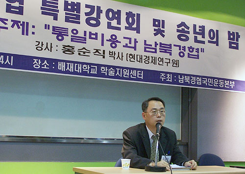 홍 수석연구위원은 이날 오후 4시 서울 정동 배재빌딩에서 남북경협국민운동본부(상임대표 이장희)가 주최한 특별강연회에 참석해 이같이 전망하고 “일각에서는 북한에 대한 일방적 지원은 퍼주기라는 지적이 있는데 북측이 경협을 위해 금강산 등 군사적 주요 지역을 내주었듯, 경제협력이 정치.군사적 문제를 해결할 열쇠가 되고 있으며 한반도 평화안정을 위한 최선의 방책이 되고 있다”고 말했다.
