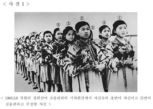 <사진1>은 1988년 3월 북한의 정희선이 조총련과의 기자 회견 중 제시한 사진이며, <사진2>는 일본 유미우리신문사가 촬영한 사진이다. 이 두장의 사진 속의 ③번 소녀가 김현희인지 여부로 논쟁이 지속되어 왔는데