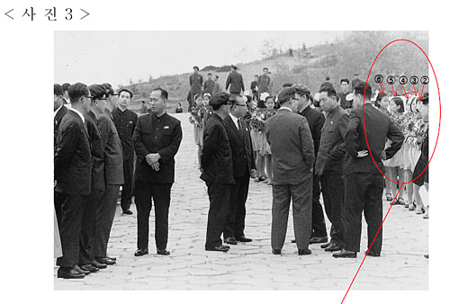 본래 스냅사진(특히 집단 사진)은 조준의 각도에 따라서, 또 본인의 자세, 예컨대 얼굴을 숙이느냐 드느냐에 따라 달라 보이는 것은 우리가 흔히 경험하는 바가 아닌가? 얼른 보기에는 <사진1>의 ③번과 <사진2>의 ③번이 달라 보인다. 그것은 전자는 고개를 숙이고 또 약간 옆얼굴인데 비해 후자는 정면이고 또 얼굴을 약간 든 데서 오는 차이가 아닌가 싶다. 자세히 보면 머리에 흰 꽃을 꽂은 모양새나 머리결이 같은 것을 알 수 있다. 발전위식으로 따지자면, <사진1>의 정희선도 <사진2>나 <산진4>와 다르다고 해야 할 것이며, ?번도 <사진4>와 비교해서 봤을 때 어느 한 쪽은 변조했다고 해야 할 것이다.