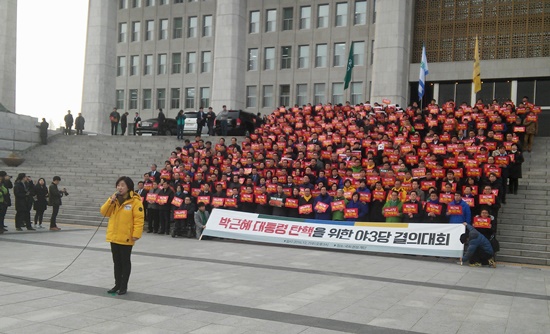 오는 9일 국회 본회의에서 ‘탄핵소추안’ 처리를 앞두고, 야 3당이 7일 오후 3시 국회 본청 계단에서 ‘박근혜 대통령 탄핵을 위한 결의대회’를 열어 공조를 다졌다. 새누리당을 향해서는 “탄핵 동참”을 촉구했다.