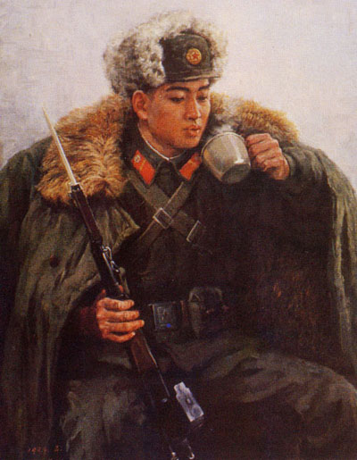 이 작품은 나라를 지키는 어린 병사가 잠깐 쉬면서 따뜻한 차를 마시는 모습을 그린 것이다. 직접 모델을 앉혀놓고 그린 것인지, 사진을 참고해서 그린 것인지는 알 수가 없다. 하지만 평양미대가 북한의 최고 미술대학이란 점을 감안한다면 직접 모델을 보고 그렸을 가능성이 높다.