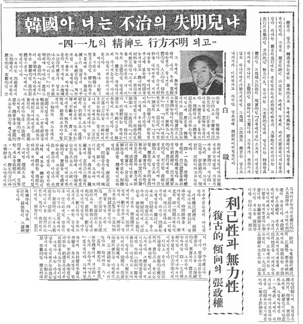 例를 들면 소위 元兇 不正蓄財 또는 行政部의 一般腐敗面은 新政府로서 數個月내에 示範的인 嚴格한 斷行을 내줬어야 할 것인데 아무것도 斷行하지 못하고 흐지부지 하는 동안에 어연간 四.一九의 돌을 맞이하게 된 事實이다. 더구나 近來에와서는 新政權이 그대로 舊政權의 腐敗 不正의 「메카니즘」을 復習하고 있는 馬脚이 表面化되어버린 事實이다. 重石의 事件이 그렇고 保安法의 補强 등이 그 適例들이다.