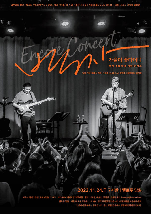 특히 지난 10월 20일 110여석의 공연장에서 발매기념 콘서트를 열어 만석을 기록해 이번에 추가로 앵콜 콘서트를 준비했다. 신희준 기타리스트와 윤건호 음향감독 등이 함께한다.